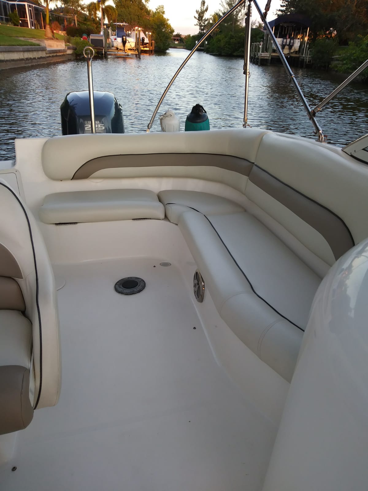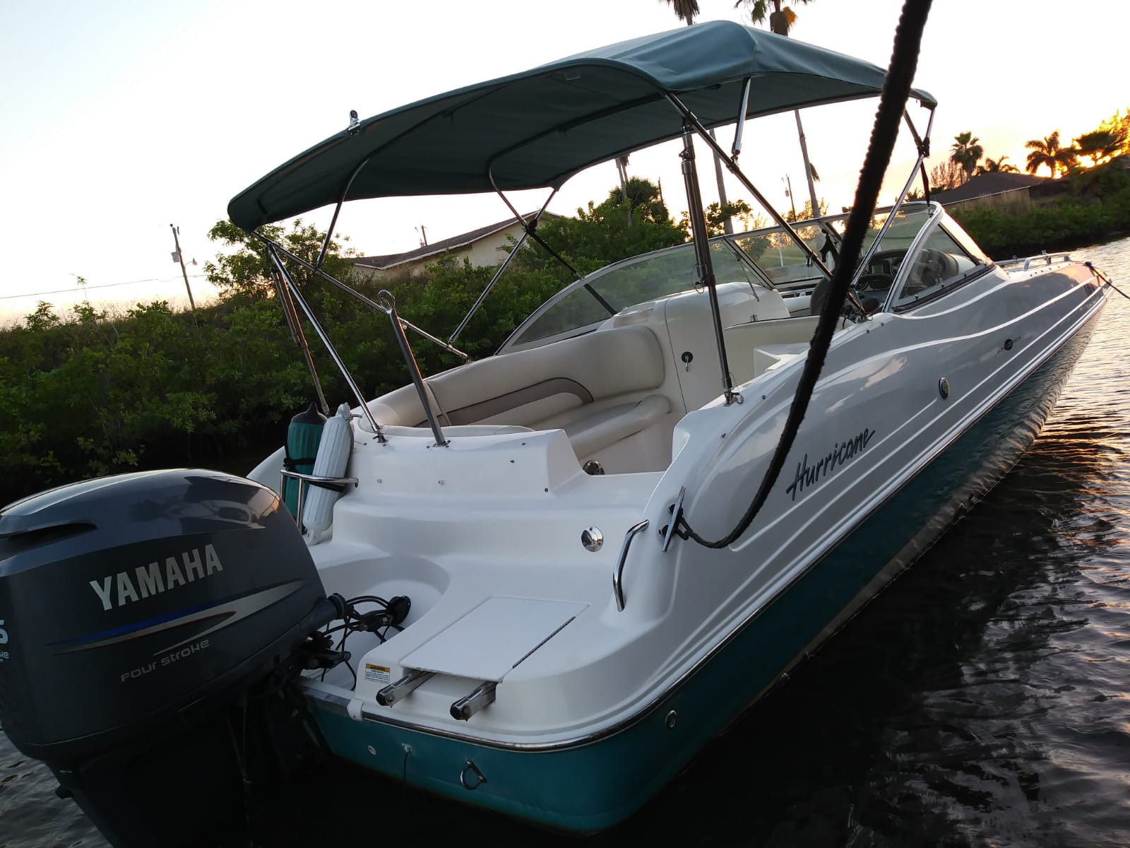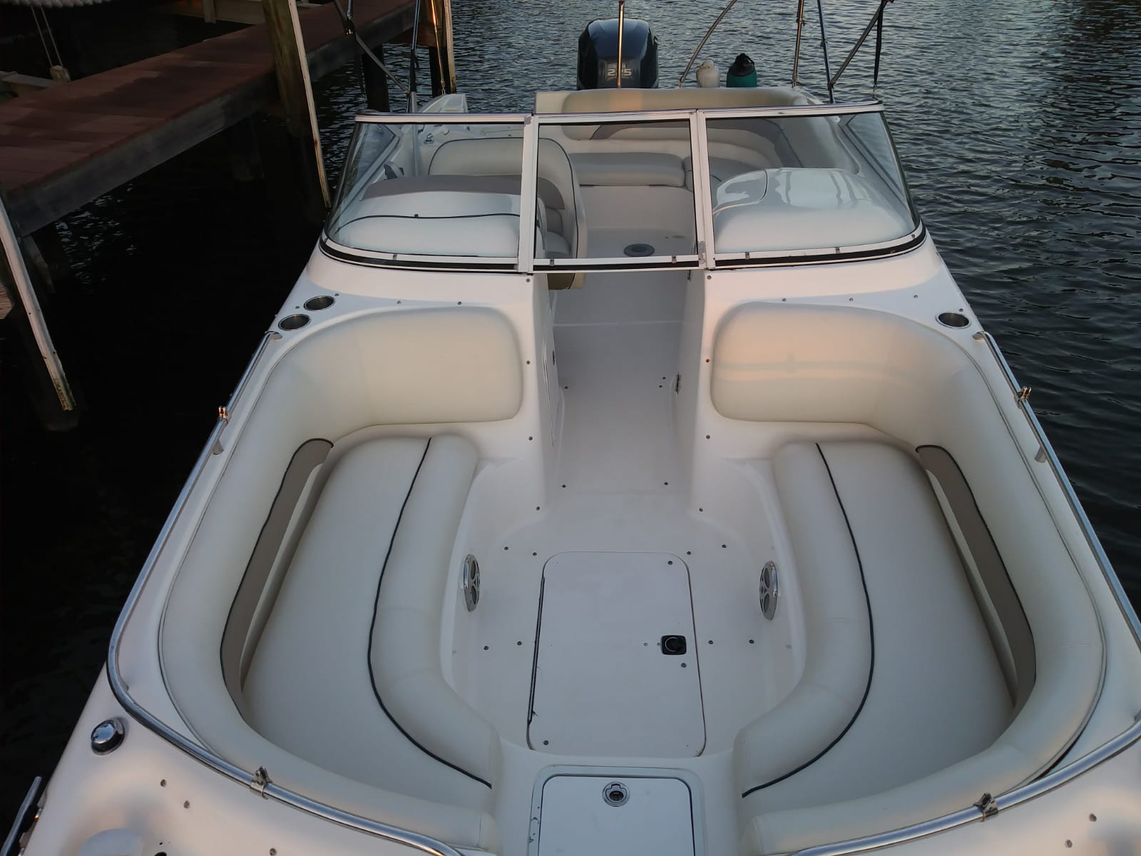 Die 24' HURRICANE 237 Sundeck Bowrider wurde 2018 neu aufbereitet – das wohl populärste Ausflugs- und Familienboot in der Region: Im vorderen und hinteren Bereich befinden sich komfortable Plätze für bis zu 7 Personen. Mit einem über den gesamten vorderen Bereich verlängerbaren Sonnenverdeck wartet nur dieses Boot mit einer Besonderheit auf, die allen Passagieren besonderen Schutz bietet – vor zu viel Sonne genauso wie vor unvorhergesehenen Regenschauern. Die Ausstattungselemente sind vielfältig. Es gibt u. a. eine Schwimmleiter, einen aufstellbaren Tisch, eine Spüle und eine Dusche. Das Boot besitzt Farb-GPS, Tiefenmesser und ein Stereo-Gerät der Sonderausstattung. Der 225 PS Yamaha Viertakt-Außenbordmotor gilt als leistungsfähig und besonders zuverlässig. Das Boot ist Baujahr 2008 und in sehr gepflegtem Zustand. Wegen seiner leichten Handhabe ist es sowohl für Kenner als auch für Anfänger die perfekte Wahl. Die Hurricane 237 liegt ruhig und stabil im Wasser, auch wenn’s mal etwas Wellengang haben sollte.