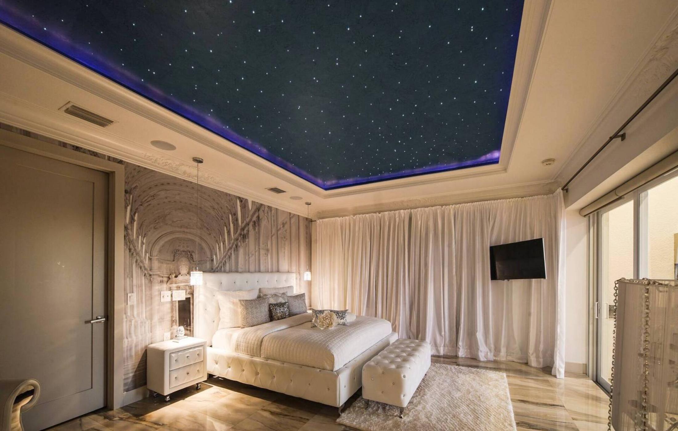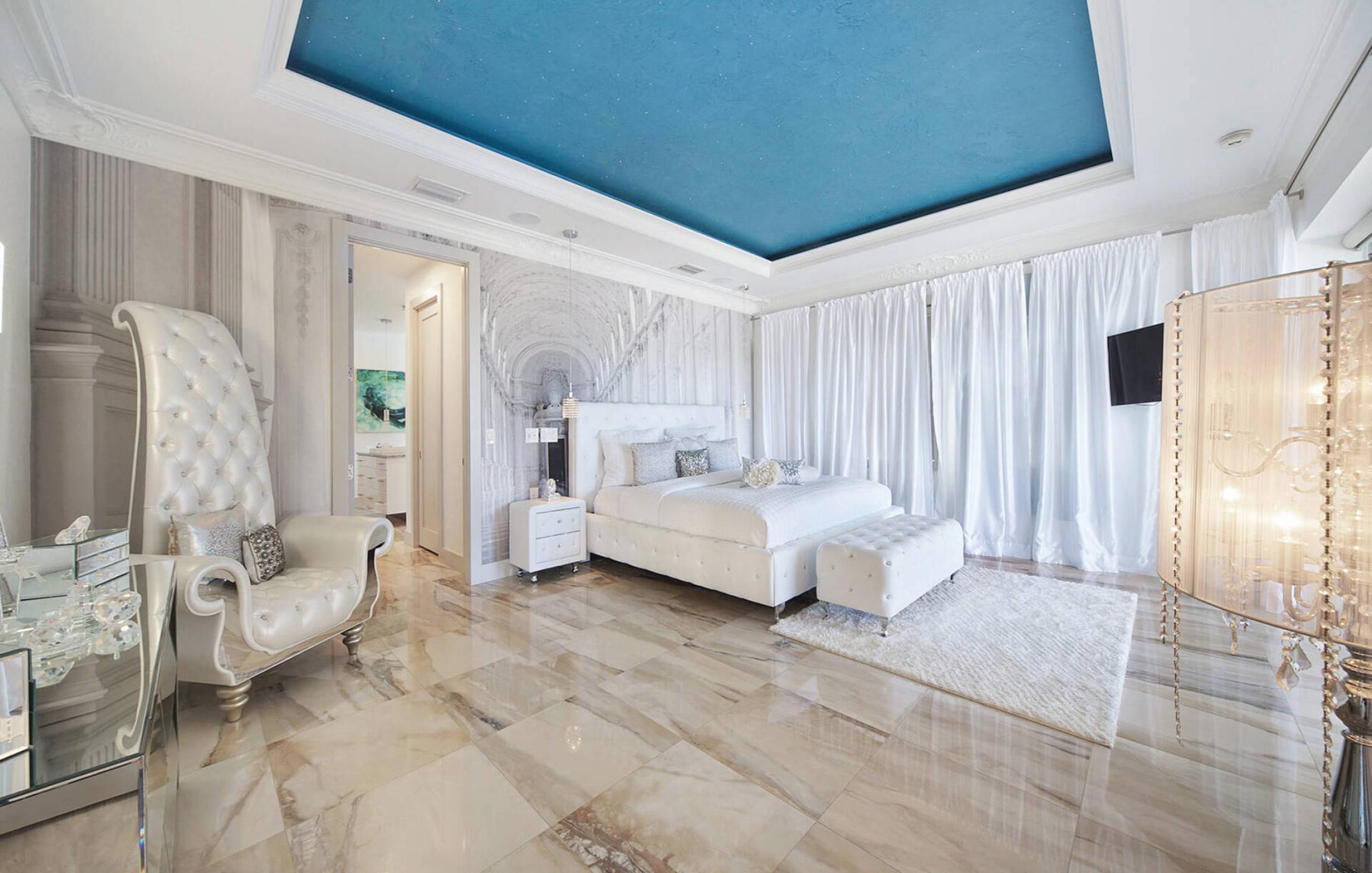 - Master-Suite 1 mit King-Bett (Untergeschoss). Diese grosse und elegante Schloss-aehnliche Suite hat direkten Zugang zum Pool und ist der ideale Ort um es sich gut gehen zu lassen. Die Wandkunst macht diese Suite zu einem besonderen Zimmer fuer unsere besonderen Gaeste.