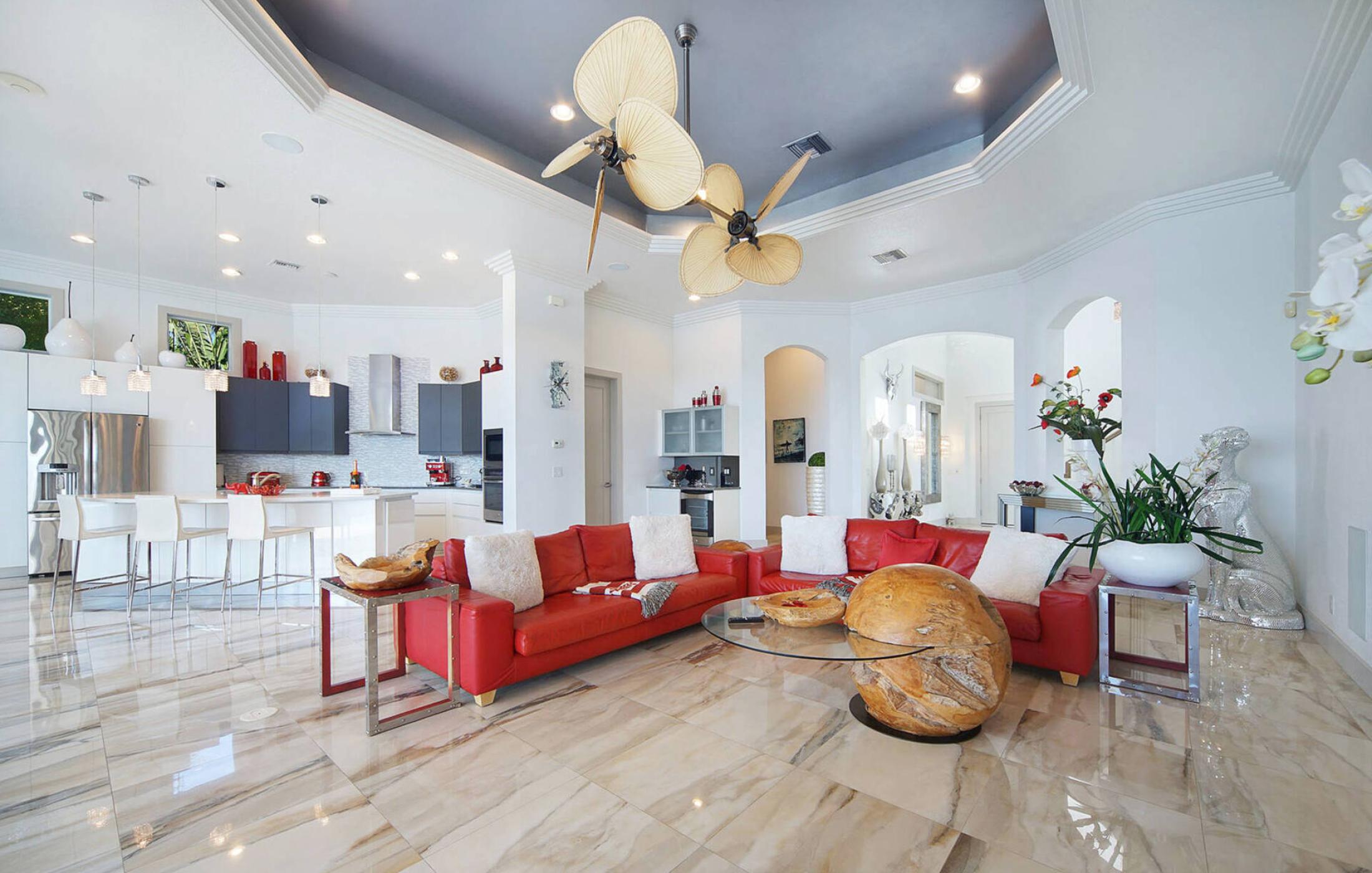Der offene Wohnbereich mit hohen Decken wurde mit Designermoebeln ausgestattet. Geschmackvolle Assessoires und Bilder ergaenzen die elegante Ambiente.