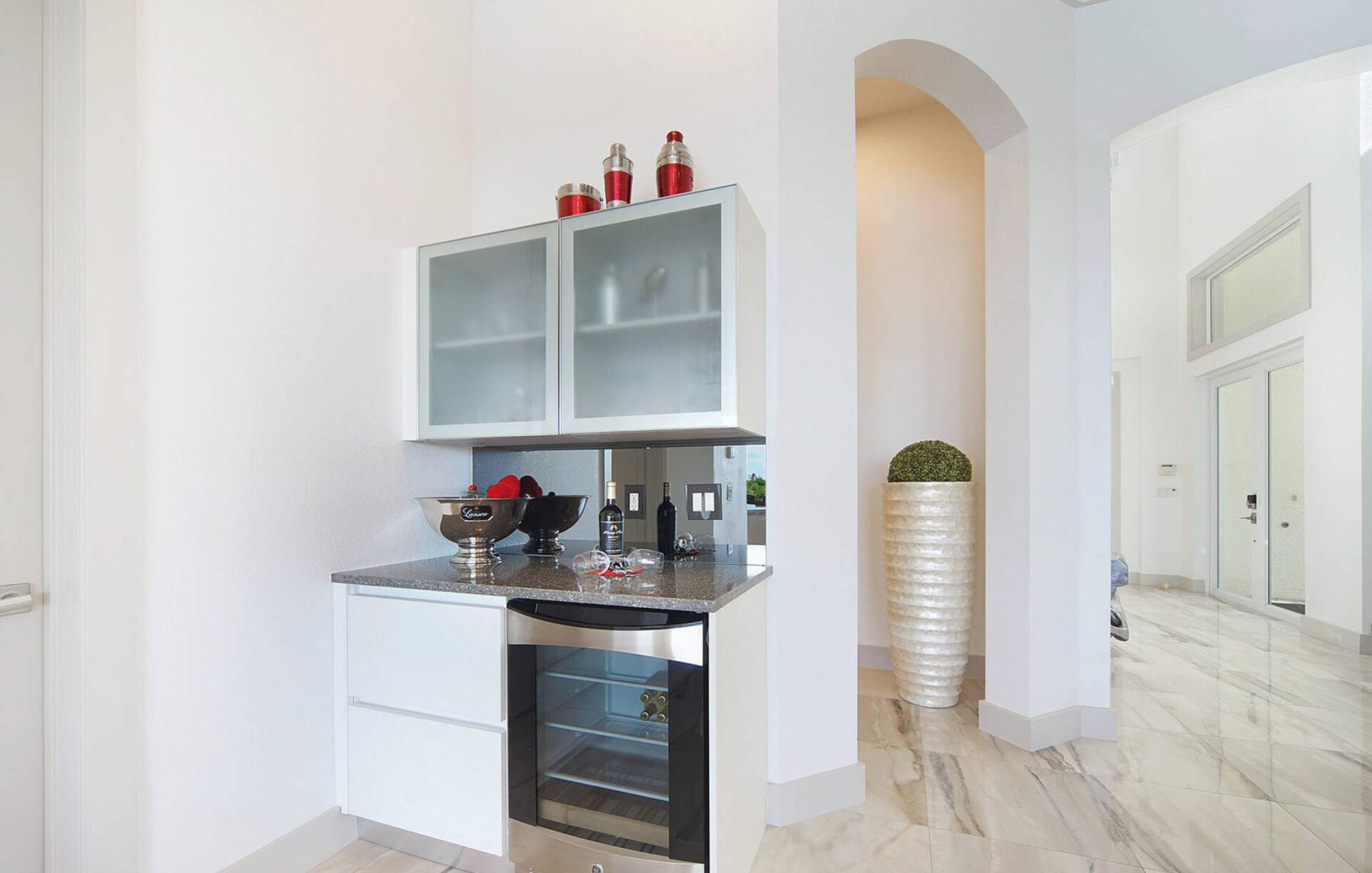 Die grosszuegige und moderne Kueche wurde speziell fuer diese Villa designed und ist komplett ausgestattet. Hier macht das Kochen Spass. Es gibt eine Kuecheninsel fuer exta Platz zum Vorbereiten und Entertainen. Weiter in diesem Grundriss gibt es den eleganten Essbereich mit einem Esstisch fuer 8 Personen. Hier koennen Sie Ihre Mahlzeiten bei einem einzigartigen Ausblick geniessen. Eine kleine Bar um sich Ihre Kaltgetraenke zu mixen steht Ihnen ebenfalls zur Verfuegung.