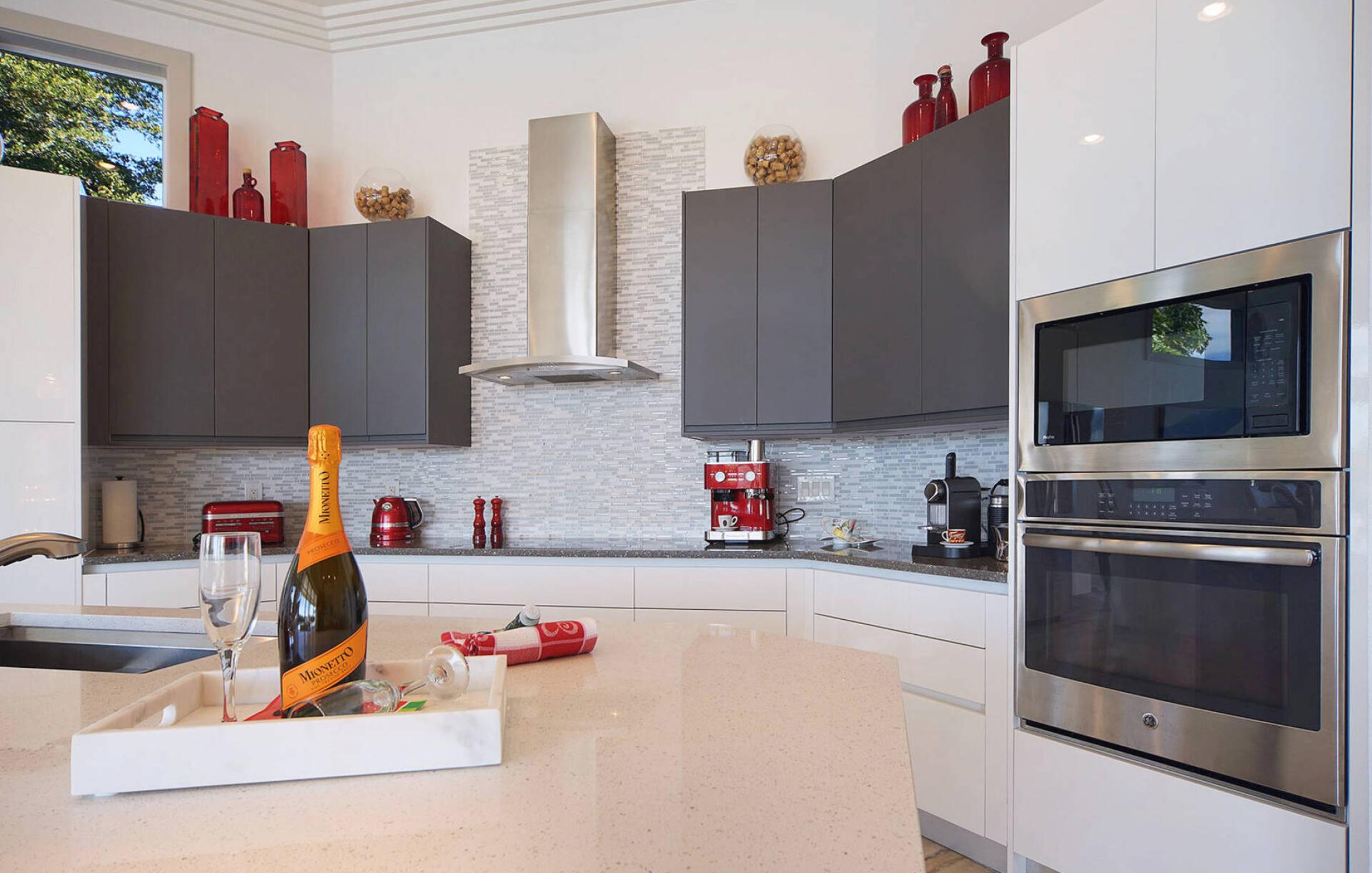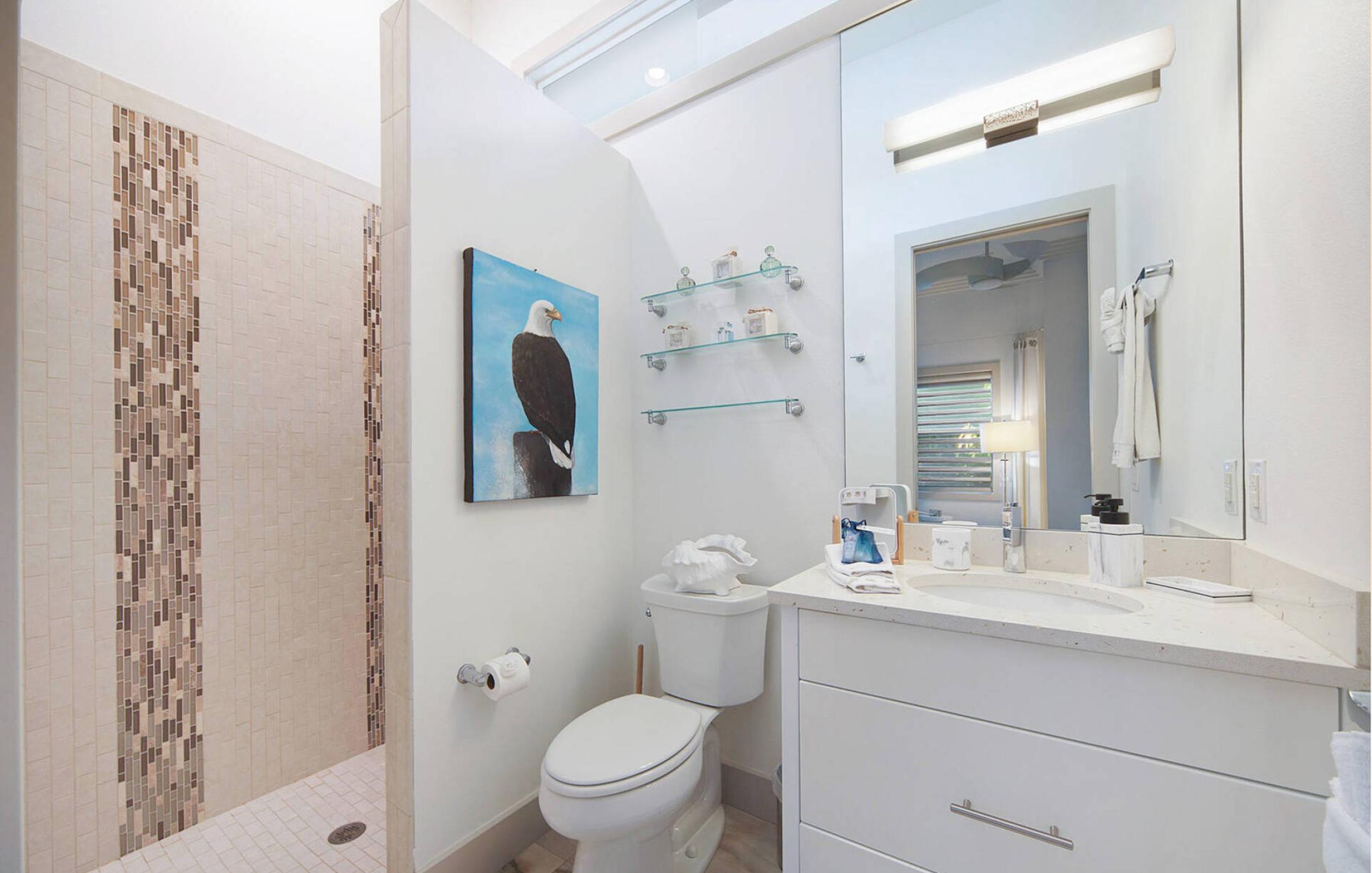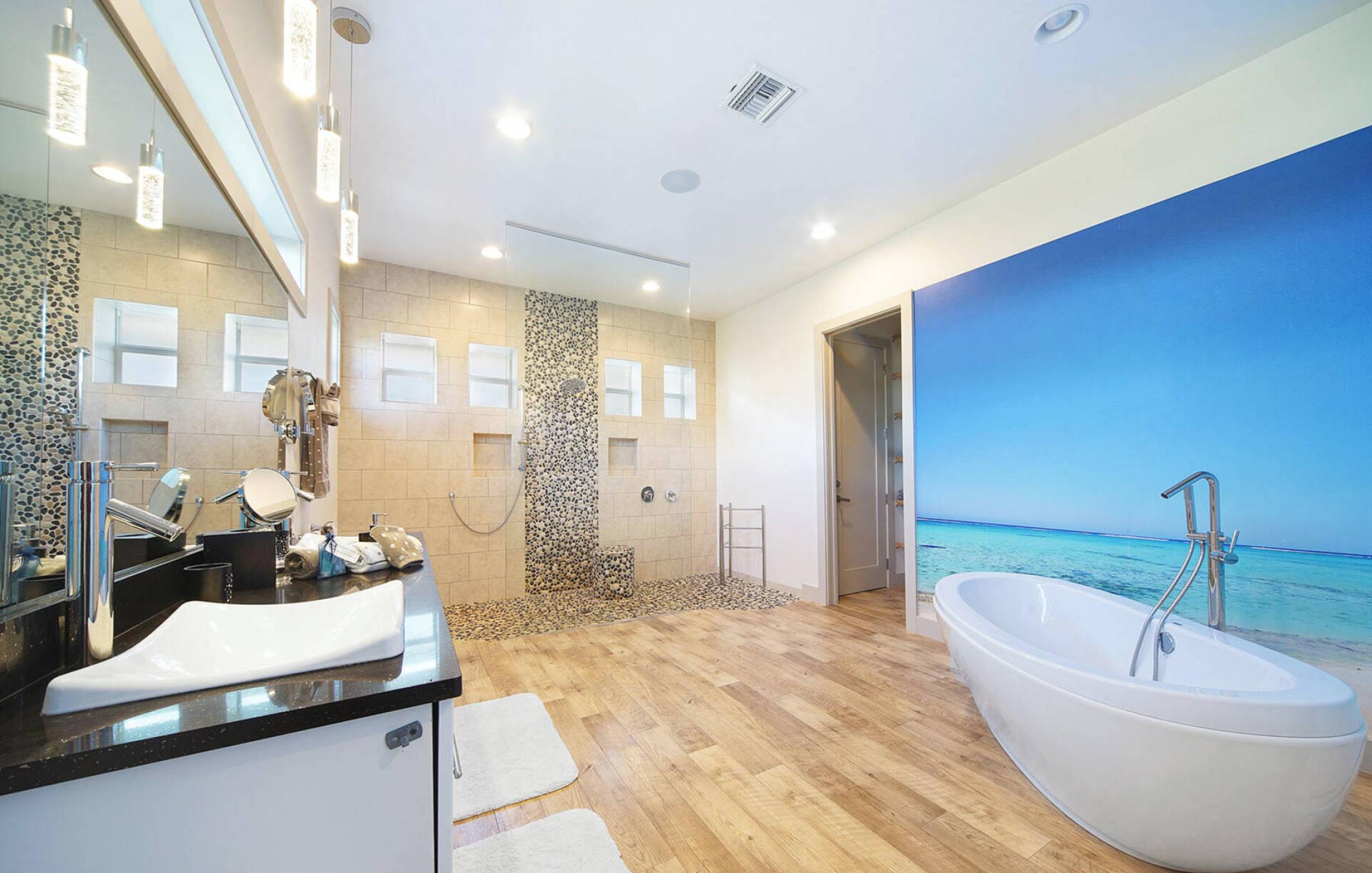 Alle Schlafzimmer wurden individuell designed und sind mit einem King-Bett und Fernseher ausgestattet. Es gibt zwei Master-Suiten, eine auf jeder Etage, um viel Privatsphaere zu bieten. Die Bilder und Assessoires wurden jedem Zimmer genau angepasst. Jedes Zimmer hat ein eigenes Badezimmer.