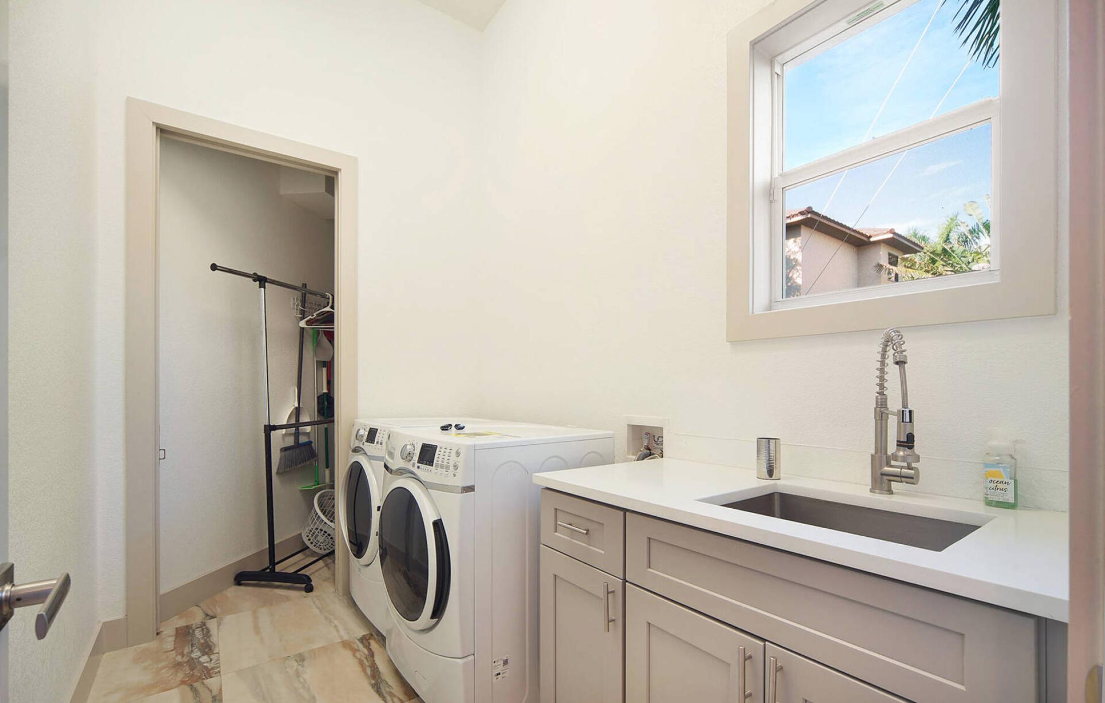 Die funktionale Waschkueche wurde mit einer hochwertigen Waschmaschine und einem entsprechenden Trockner ausgestattet und verfuegt über Buegelequipment und Reinigungsutensilien.
