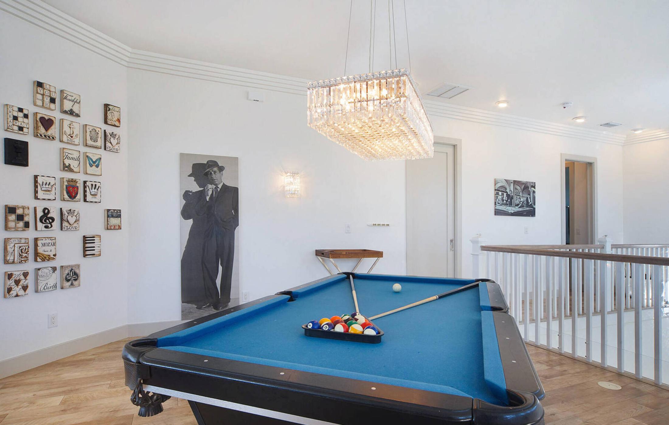 Ueber die Treppen gelangen Sie zum Obergeschoss. Der obere Wohnbereich wird als Entertainmentzimmer genutzt und ist mit einem Billiardtisch, einer Sitzecke mit Fernseher und Spielen ausgestattet. Auch von hier aus haben Sie Zugang zum Balkon.