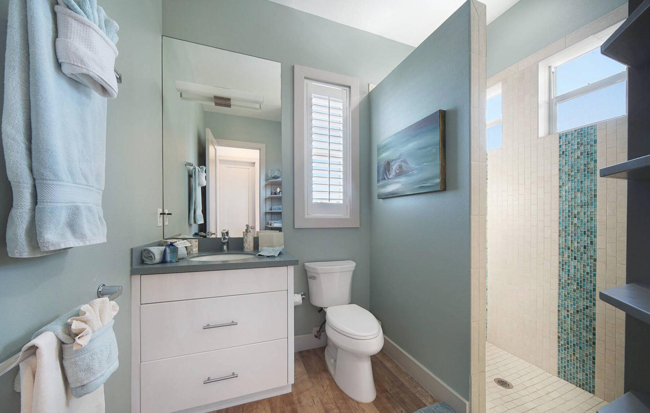 Die zwei Master-Suiten haben ihr eigenes grosses Badezimmer mit begehbarer Regendusche. Die Master-Suite im Obergeschoss hat zusaetzlich eine freistehende Badewanne zum Entspannen. Die zwei Gaestezimmer haben ebenfalls ein en-suite Badezimmer mit begehbarer Dusche. Ausserdem gibt es ein kleines Gaestebad im Untergeshoss. Alle Badezimmer sind mit hochwertigen Materialien ausgestattet.